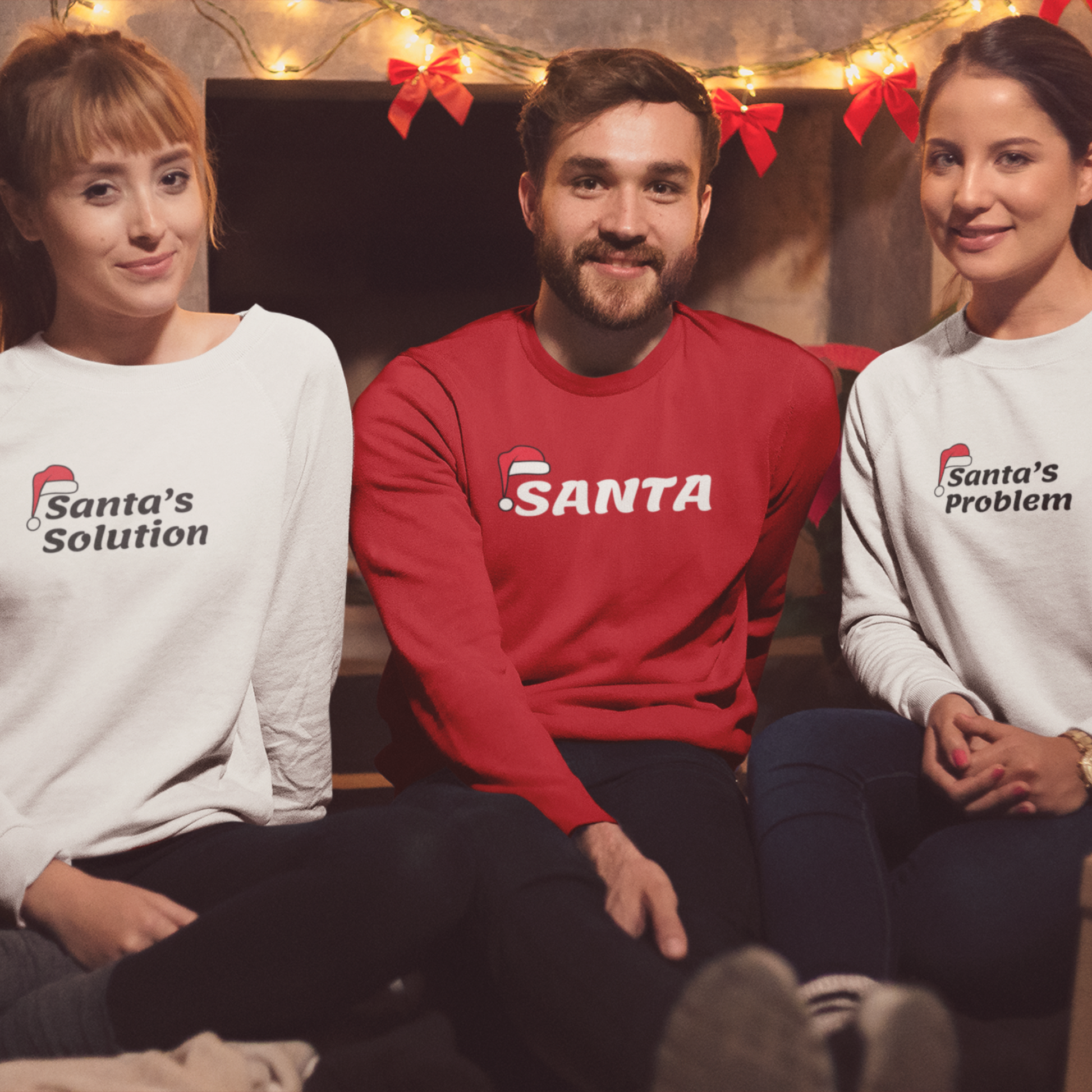 - 3 sweatshirts: “SANTA,” “Santa’s Solution,” and “Santa’s Problem”